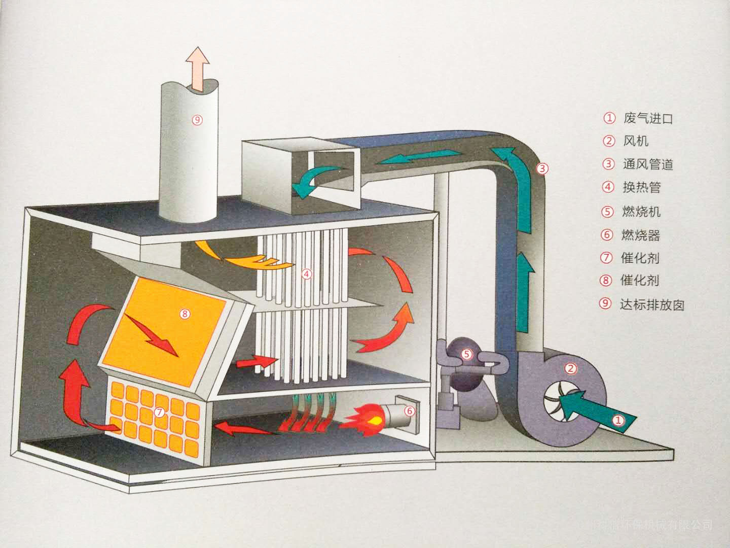 催化燃燒設備工作原理,在工業生產過程中,排放的有機尾氣通過引風機進入設備的旋轉閥,通過選轉閥將進口氣體和出口氣體完全分開。氣體首先通過陶瓷材料填充層(底層)預熱后發生熱量的儲備和熱交換,其溫度幾乎達到催化層(中層)進行催化氧化所設定的溫度,這時其中部分污染物氧化分解;廢氣繼續通過加熱區(上層,可采用電加熱方式或天然氣加熱方式)升溫,并維持在設定溫度;其再進入催化層完成催化氧化反應,即反應生成CO2和H2O,并釋放大量的熱量,以達到預期的處理效果。