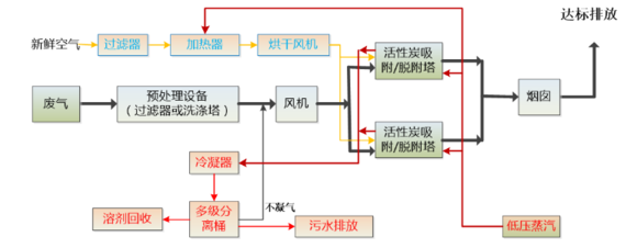 脫附過程:活性炭使用一段時間后處于飽和狀態(tài),此時需對活性炭進(jìn)行再生處理,脫附再生選用加溫解析法,將高溫蒸汽自塔底噴入罐內(nèi)將有機(jī)物從活性炭中剝離,