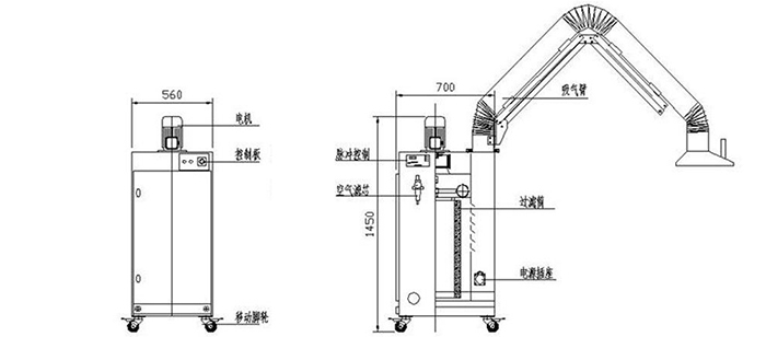 1)凈化器同離心風(fēng)機(jī),濾筒過濾室,進(jìn)風(fēng)均流板,集塵抽屜,凈化器室體,脈沖清灰系統(tǒng),電控裝置及帶吸塵罩柔性吸氣臂組成.