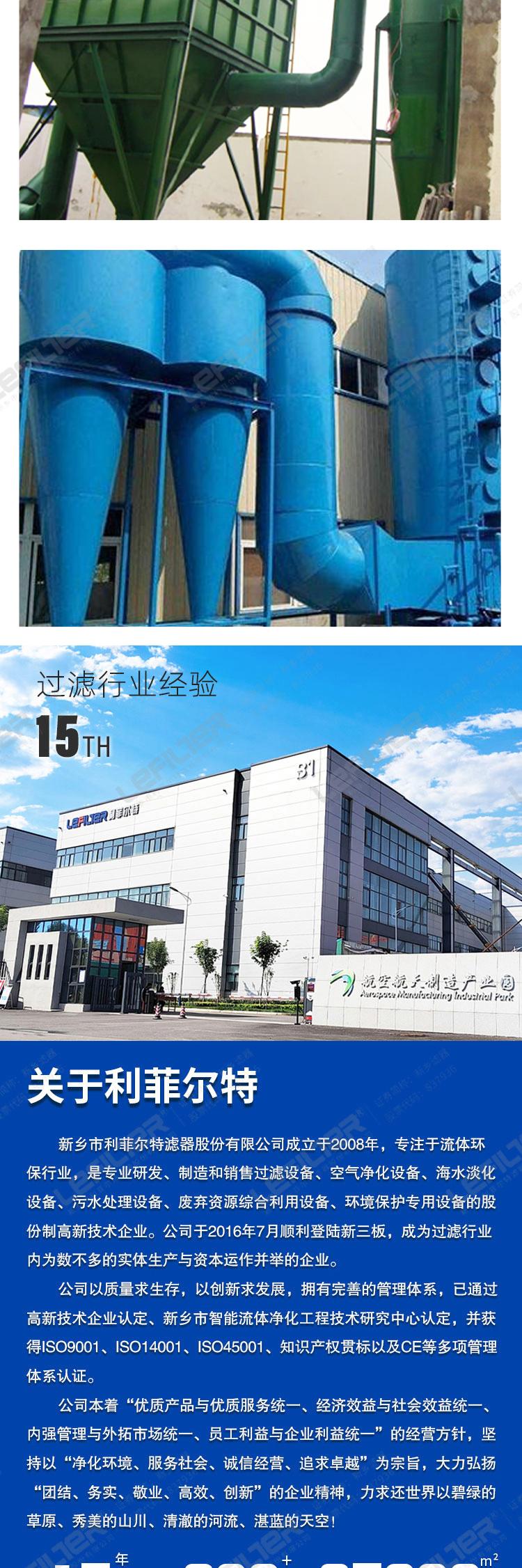 旋風除塵器是一種利用旋轉氣流產生離心力使煙塵顆粒從氣體中分離出來的設備。它的特點是結構簡單,體積較小,價格實惠,方便操作,維修簡單。動力消耗不大,適應高溫氣體。但旋風除塵器只適用于收集大于10μm的粉塵,對于小于5μm的微粒捕集效率較低,收塵效率大約在60%-90%。